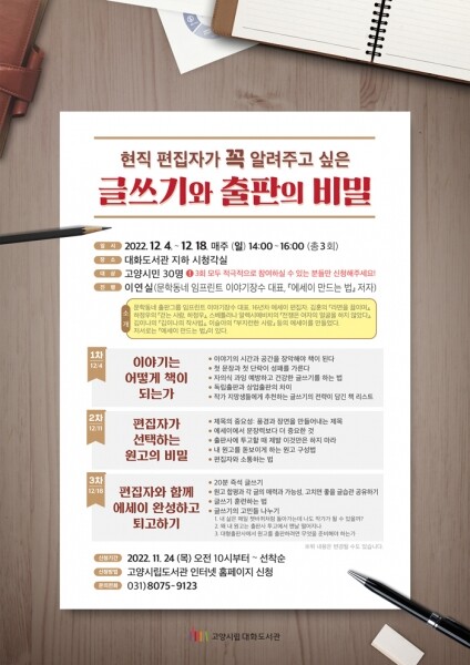 글쓰기 역량을 키우는 것에 관심이 있는 고양시민 30명을 대상으로 매주 일요일 오후 2시부터 4시까지 운영한다.