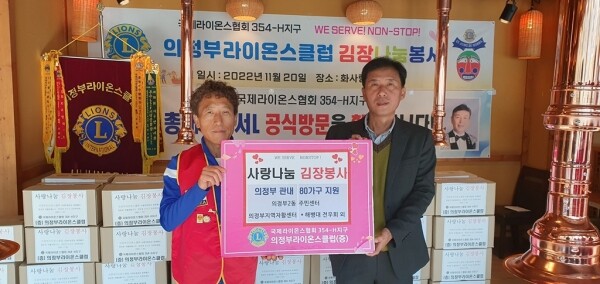 이광주 의정부라이온스클럽 회장은 “소외된 지역 어르신들을 위한 김장김치를 회원 30명이 모여 정성껏 준비했다”며 “따뜻한 겨울을 보내는 데에 조금이나마 도움이 됐으면 좋겠고 앞으로도 어려운 이웃을 돌아보며 나눔 실천을 위해 노력하겠다”고 말했다.