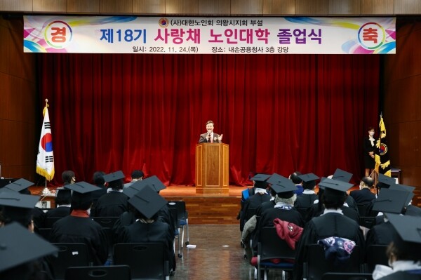 김성제 의왕시장은 “어려운 상황에서도 끝까지 학업 과정을 마치고 사랑채노인대학을 영예롭게 졸업하시는 124분의 어르신과 수상자들에게 축하를 전하며 시에서는 지속적으로 지역 어르신들의 노인복지 향상을 위한 다양한 지원방안과 시책개발에 노력하겠다”고 말했다.