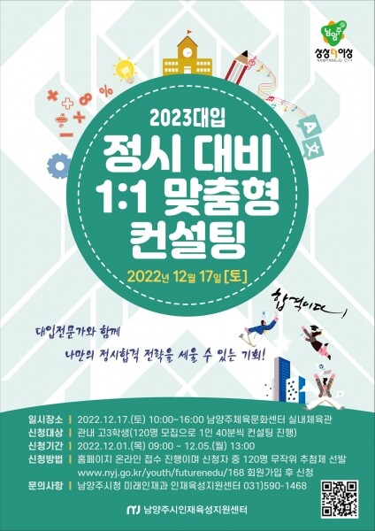 시 관계자는 “이번 컨설팅은 정시 원서 접수를 앞둔 수험생과 학부모의 입시에 대한 부담감을 덜고 맞춤형 지원 전략 제공으로 대입 경쟁력을 강화하고자 마련됐다”며 “학생들이 자신의 목표를 위해 노력해 온 만큼 대학 입학에 좋은 결과가 있길 바란다”고 전했다.
