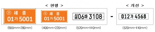 가령, 영업용 차량의 경우 기존에는 주황 표지판에 ‘ 경기 01가5001’로 표기되었던 것이 개편한 표기 방법을 적용하면 주황 표지판에 검은 글씨로 ‘012가5001’로 표기된다.