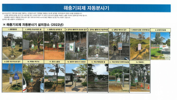 게시한 자료에는 읍면동별 모기 유충서식지 현황 원격모기감시장비 및 모기밀도 해충퇴치기 설치 장소 기피제 자동분사기 설치 장소 현황 등으로 시민들이 한눈에 알 수 있도록 정리되어 있다.