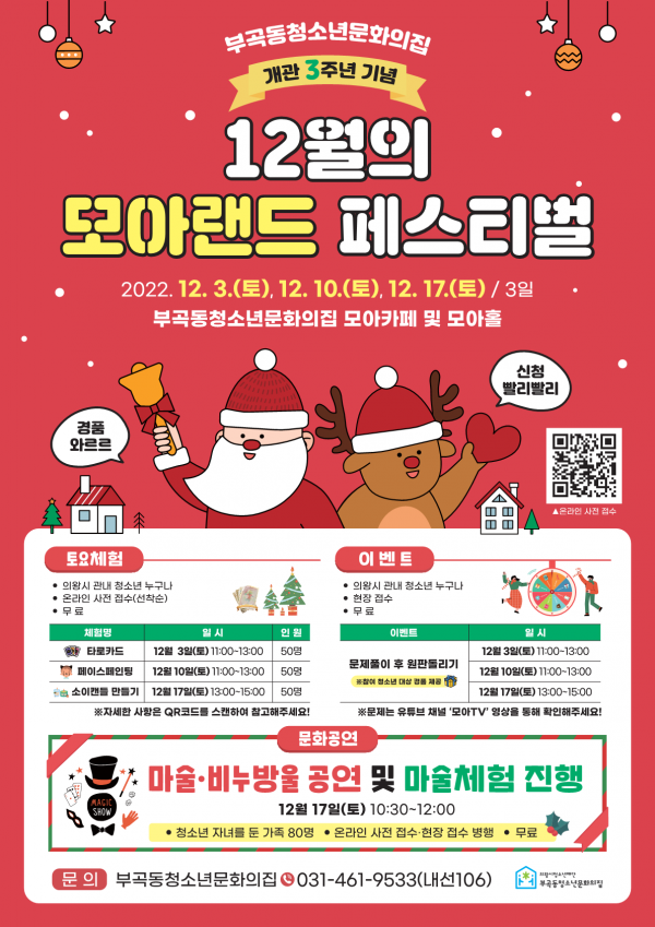 오는 12월 3일 10일 17일 3일에 걸쳐 부곡동청소년문화의집 1층 모아카페와 4층 모아홀에서 진행되는‘12월의 모아랜드 페스티벌’행사는 청소년콘텐츠제작단 청소년들이 주도적으로 홍보영상을 제작했다.