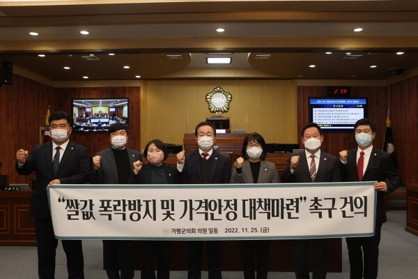 또한, 가평군의회에서는 장기간 지속되고 있는 코로나-19 여파와 최근 러시아·우크라이나 전쟁에 따른 비료·농약 가격 및 인건비·유류비 등 영농자재 비용은 엄청난 폭등을 하고 있으나, 우리 국민의 주식인 쌀값은 계속 떨어져 45년 만에 최대 하락폭을 기록하고 있는 만큼, 쌀값 폭락방지 및 가격안정 대책마련을 촉구하는 건의문을 채택했다.