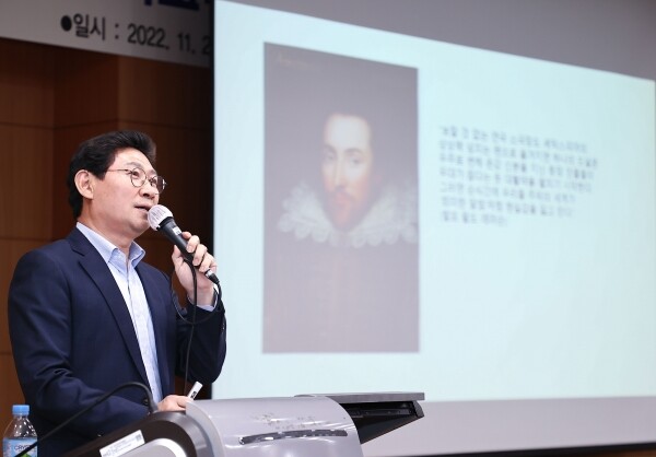 이상일 용인특례시장이 24일 셰익스피어의 4대 비극과 그 밖의 희곡 내용을 그림에 곁들여 설명하면서 ‘인간과 인생’에 대해 강의를 했다.