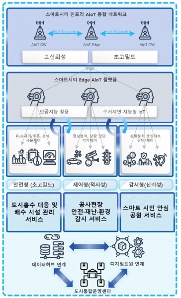 이 기술로 시는 1㎢ 범위에서 하루 100만건 이상의 데이터를 처리하는 초대규모 AIoT 네트워크를 구축해 탄천 유역의 도시홍수 대응 및 배수시설 관리 도심지 공사 현장 안전·재난·환경 감시 스마트 시민 안심 공원 조성 등 3종 실증 서비스를 추진한다.