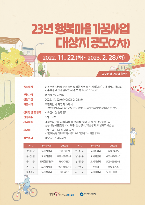 한편 인천시는 2023년 2월 28일까지 제2차 2023년 행복마을 가꿈사업 대상지 공모를 통해 5개소 내외의 사업 대상지를 추가로 선정한다는 방침으로 다양한 군·구의 소규모 마을단위 재생사업 대상지를 발굴할 수 있도록 사업을 적극 홍보하고 군·구 담당부서를 독려할 계획이라고 전했다.