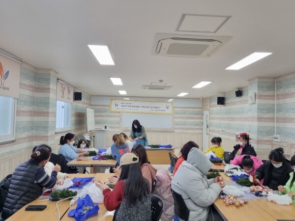 이번 교육은 크리스마스 기념으로 부모와 자녀가 함께 리스를 만들며 즐거운 추억을 쌓고 좋은 기운이 가정으로 들어오기를 소망하는 마음으로 진행됐다.