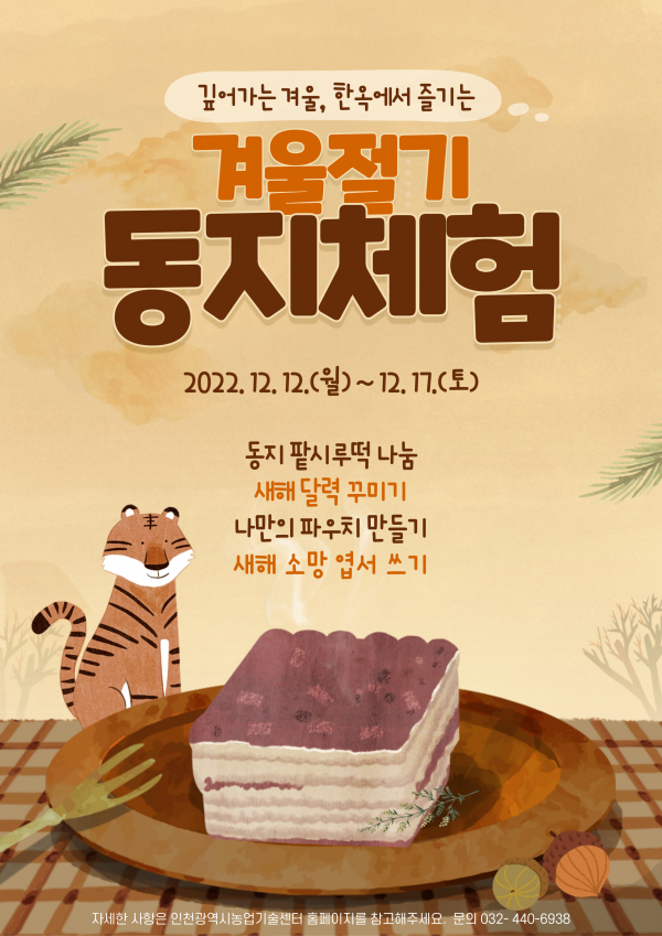 체험은 농업기술센터 전통문화체험교육관‘인희재’에서 진행되며 동지풍습인 동지첨치, 동지책력 등을 체험해 볼 수 있다.