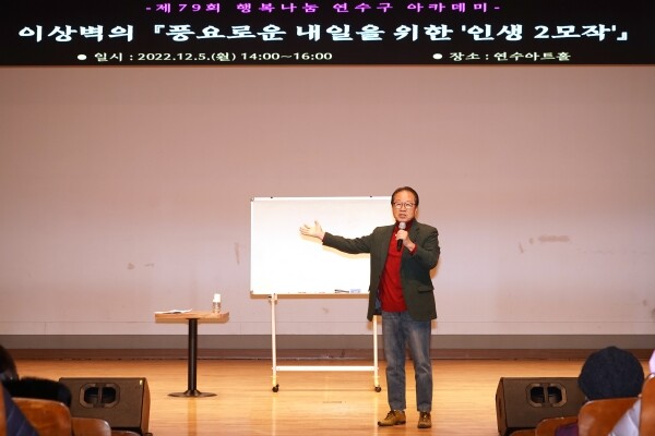 이번 제79회 행복나눔 연수구 아카데미는 꿈, 끼, 꾀, 꼴 이라는 글자를 통해 본인의 50년 방송인생과 삶에 대한 철학을 담은 풍요로운 제2의 인생 설계에 대한 명쾌한 해법을 제시하는 내용으로 진행됐다.