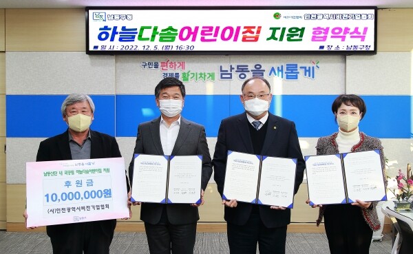 협약식에는 박종효 남동구청장, 인천광역시비전기업협회 김동훈 회장, 국공립 하늘다솜어린이집 이은희 원장이 참여했다.