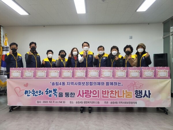 지난 11월에 이어 관내 어려운 이웃 25명의 건강한 식생활과 안부확인을 위해 마련한 이번 행사는 송림4동에서 추진한 ‘만원의 행복’ 정기 기부사업을 통해 모금된 재원으로 진행했다.