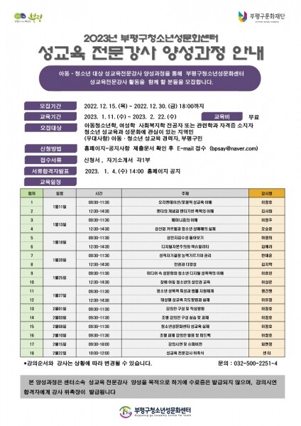 이정호 부평구 청소년성문화센터장은 “지역의 아동·청소년 성교육과 성문화에 관심을 갖고 전문강사로서의 역량을 갖추고자 하는 분들의 많은 관심과 참여를 부탁한다”고 말했다.