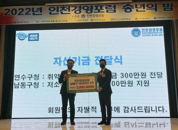 이번 기탁식은 인천경영포럼 송년의 밤 행사에서 진행됐으며 후원금은 남동구 아이리더 프로그램을 통해 저소득 학생들의 장학금으로 지원될 예정이다.