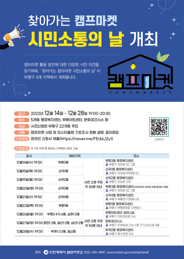 인천광역시는 캠프마켓이 위치한 부평구 9개 지역에서 캠프마켓 활용방안에 대한 ‘찾아가는 캠프마켓 시민소통의 날’을 개최한다고 밝혔다.