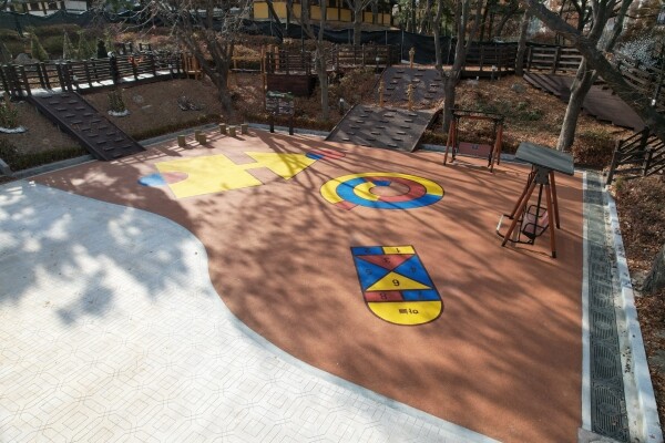 특히 탄성포장 된 바닥에는 사방치기, 오징어게임, 달팽이놀이 등 전통놀이를 그려 넣어 부모와 아이들이 마음껏 뛰어놀 수 있는 공간으로 조성했다.