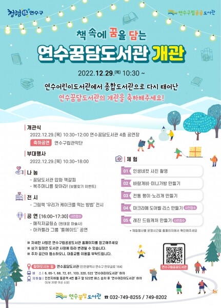 이날 ‘연수꿈담도서관’ 개관식에서는 연수구립관악단의 축하공연을 시작으로 축사 및 축하 테이프 커팅과 다양한 이벤트, 체험행사와 공연 등이 다채롭게 펼쳐질 예정이다.