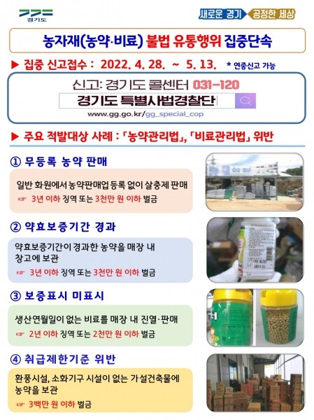 김민경 경기도 민생특별사법경찰단장은 “본격적인 농번기가 시작되고 도시민들의 화훼에 대한 관심이 높아짐에 따라 불량 농약 비료 유통은 농가 및 일반소비자에게 커다란 피해를 줄 수 있다”며 “올해부터 도 31개 시·군으로 수사 대상을 확대하고 적발된 업체는 엄중 대처할 것”이라고 말했다.
