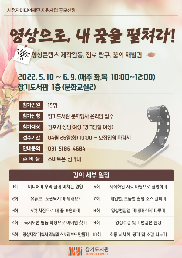 수강신청은 4월 26 10:00부터 장기도서관 누리집에서 온라인으로 진행하며 선착순 15명까지 접수 가능하다.