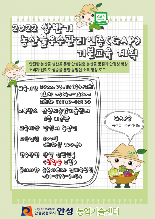 GAP는 농산물의 생산단계부터 판매단계까지 농산식품의 안전관리체계를 구축해 소비자에게 안전한 농산물을 공급하기 위한 제도로 인증 유효기간은 2년이다.